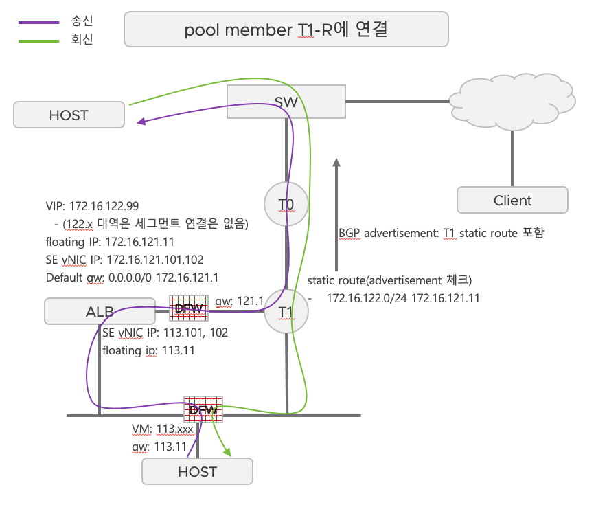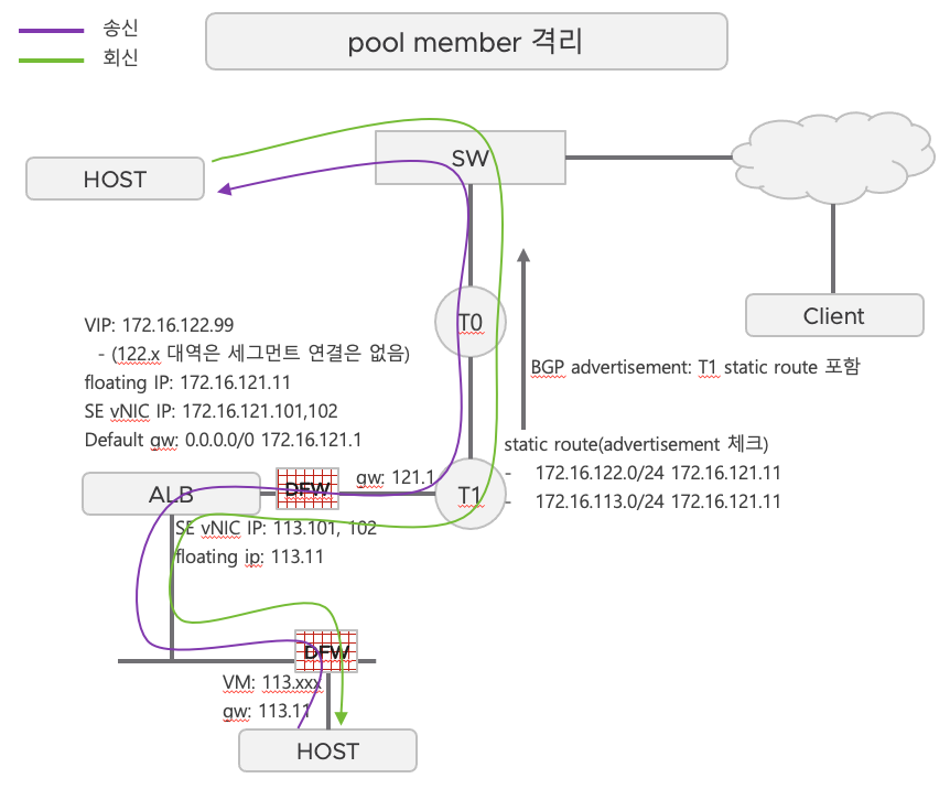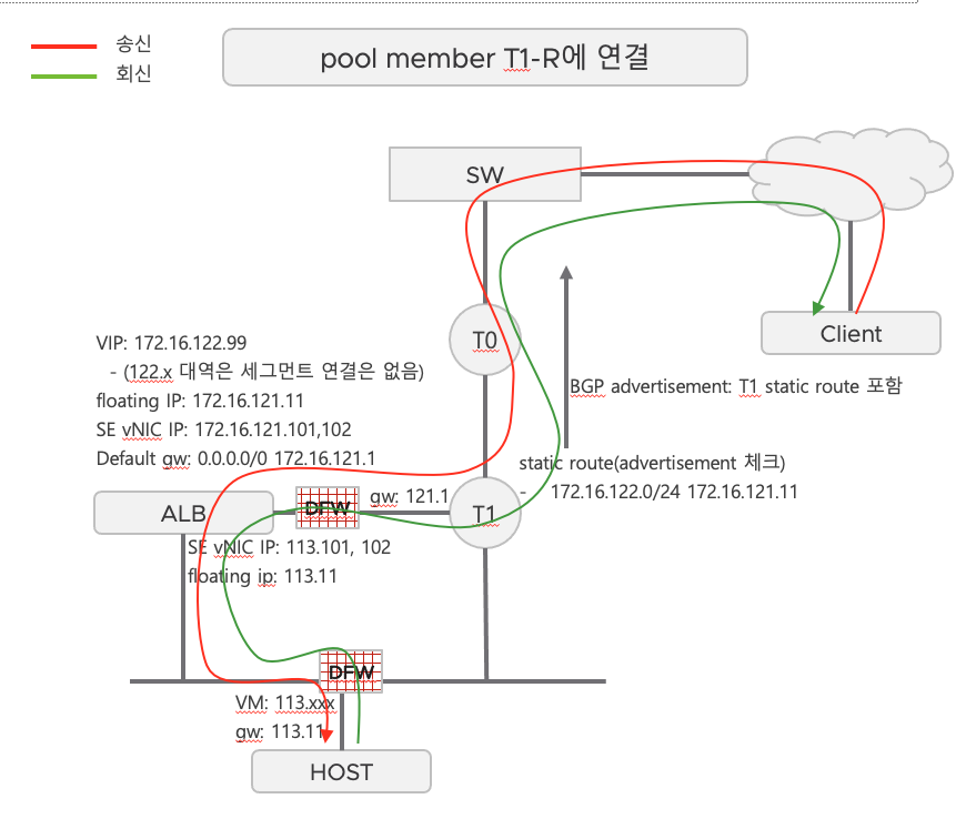 i) LB의 pool member에 속하지 않은 서버: T1 라우터의 IP를 게이트 웨이 주소로 사용