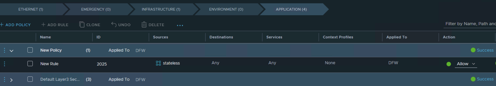 그러나, NSX-T의 분산 방화벽은 stateless 기능을 지원하고 있기에 해당돠는 IP 혹은 IP 대역만을 지정하여, 새로운 방화벽 정책을 추가하고 적용을 한다면, LB pool member에 대해서만 stateless 동작을 통해서 문제 없이 비대칭 트래픽 흐름에서도 동작을 시킬 수 있습니다.