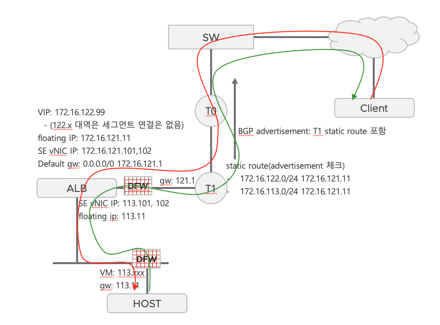 우리는 기존 세그먼트에서 이미 다수의 VM들이 Gateway 주소로 T1 라우터를 가지고 있고, 동일 세그먼트에 있는 일부 서버를 인라인 모드 LB를 구성하고 있는 특이한 상황이라는 점을 잊지 않아야 합니다.