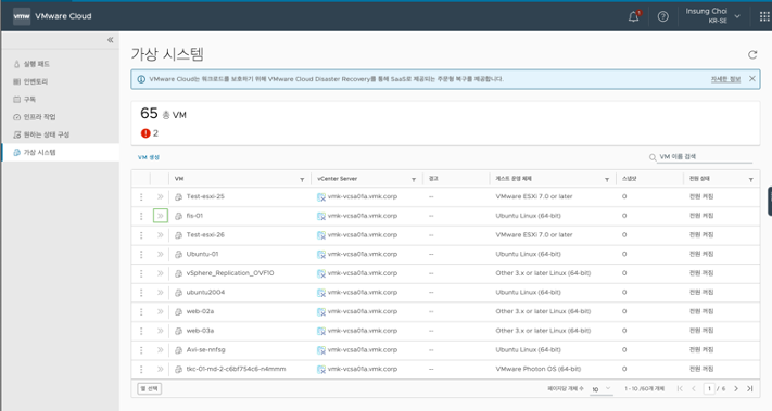 VMware Cloud Console UI를 통해서 간단 명료한 SDDC 인벤토리 정보를 제공하며, 산재한 vCenter를 하나의 콘솔 화면을 통해서 리소스 소비 정보, 라이센스 구독 정보, 이벤트 정보, 보안 취약 정보, vCenter 수명 주기 관리 및 VM 배포를 지원합니다.