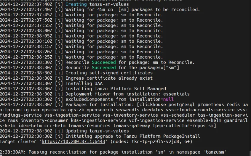 tanzu-sm-installer install -f config.yaml -u "${REGISTRY_USERNAME}:${REGISTRY_API_TOKEN}" -r ${LOCAL_REGISTRY} --install-version ${TANZU_SM_VERSION}